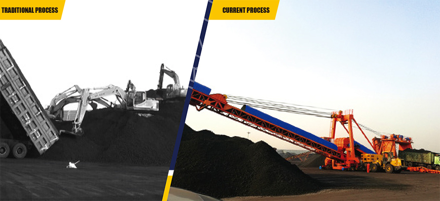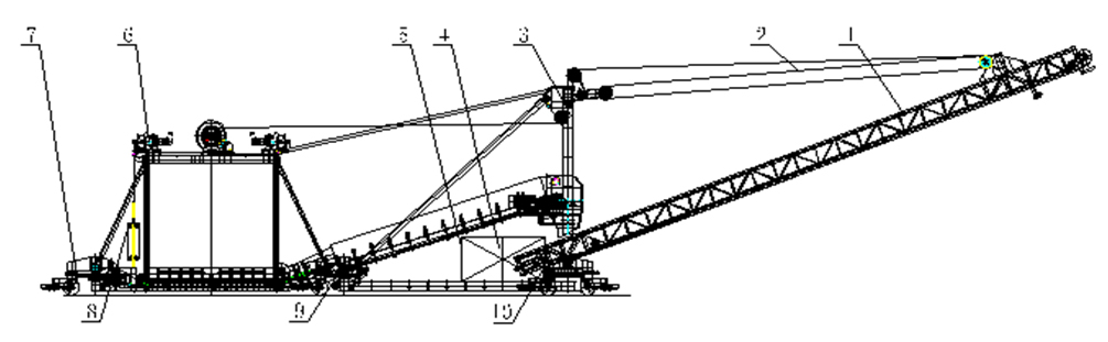![]() 1. belt conveyor system, 2. arm frame pitching system, 3. metal structure, 4. diesel engine unit, 5. electrical system, 6. upper train and door frame, 7. walking mechanism, 8. counterweight system, 9. hydraulic system, 10. arm frame rotary mechanism. ![]() Equipment Technical Specification 1).Process Flow :Bulk cargo transported by truck- -Feeder chute- -Feeding Belt conveyor- -Transfer chute- - boom conveyor--Material field 2). To meet environmental requirements, using water spray dustproof technology. The water spraying system is installed in the feeder chute, the transfer chute and the boom discharging point to control dust. Water tank set capacity is 6 cubic meter, can be adjusted according to the actual situation; 3). Boom belt conveyor provided with pitch function and slewing function , fixed-point stacking material tonnage is about 4000 ton, to handle 4 million tons ocean vessel it only need to move ten times; 4).Equipment with self-moving function, using a full drive mode of moving, wheels can be rotated at the same time and also rotated separately, so it can move forward and backward, translation around, in-situ rotation and other multiple degrees of freedom of action. Rapid displacement can be achieved in the process of stacking; 5). The driver room is set in front of the device, with wide view when operating, HD cameras are set on many places of device, The driver can grasp all conditions around the equipment and work condition by means of monitor; 6). The belt conveyor drive motor and the traveling motor all adopt the frequency conversion motor, can adjust its operating speed according to the actual loading condition; 7). Device Set up Truck Dual Lane , to reduce truck waiting time, and greatly improve working efficiency; 8).Feeding model : trucks(<60 tons), loading vehicles(<10tons) 9). 40tons-truck running time is 60s, one-hour cycle 60 times, device effective work efficiency is 2400t/h; Maximum allowable truck overload is to 60 tons, productivity instantaneous peak is 3600t/h.